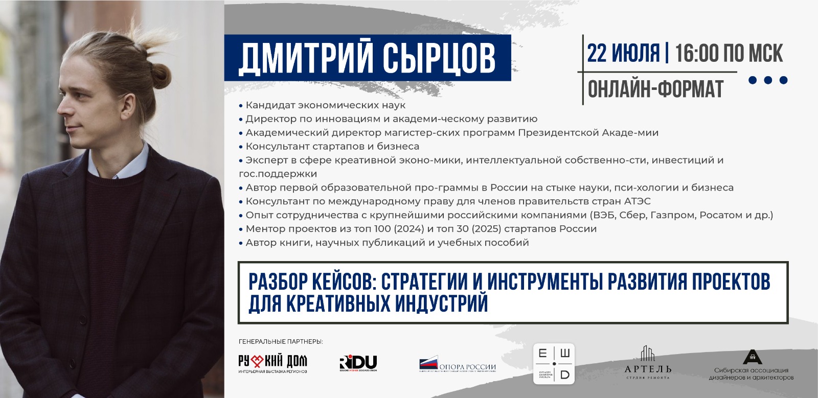 Спикер: Дмитрий Сырцов — кандидат экономических наук, директор по инновациям и академическому развитию РАНХиГС, эксперт в области креативной экономики, интеллектуальной собственности и инвестиций, консультант ведущих российских стартапов и ментор проектов из ТОП-100 страны.